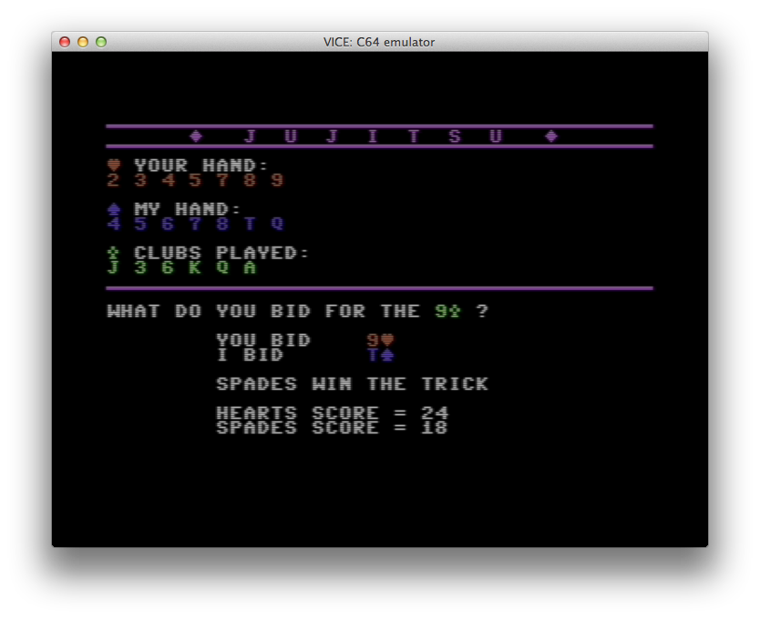 Just about the simplest possible bidding game - cards from one suit (clubs) are dealt, and each player bids from their suit, higher card takes the trick. (Human is hearts, Computer is spades). Huh! I remember getting weirdly into this same game in a different form... for some reason my college freshman roommate decided to run a programming competition and build programs that played this game and sent them against each other. I think we both punted though, disregarding what the opponent was doing, and just using statically assigned values... not very impressive! Anyway, twenty years later I started thinking about the problem, and how my roomie and I "solved" it, and